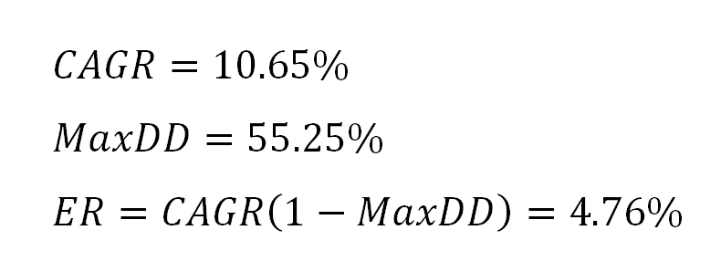 I define the effective return as multiplication of Compound Annual Growth Rate (CAGR) by (1-MaxDD). MaxDD is defined as percentage and is always below 1, so 1-MaxDD is always a positive number below 1 and as a result ER is always a number lower than CAGR.