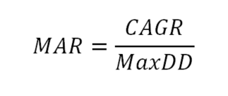If we define risk as MaxDD, then a suitable risk adjusted metric could be a combination of return and MaxDD. MAR ratio introduced in 1978 by Leon Rose is one such risk-adjusted return metric. It was introduced in the Managed Accounts Report newsletter and gets its name from that publication. It is the ratio of Compound Annual Growth Rate (CAGR) and Maximum Drawdown (MaxDD):