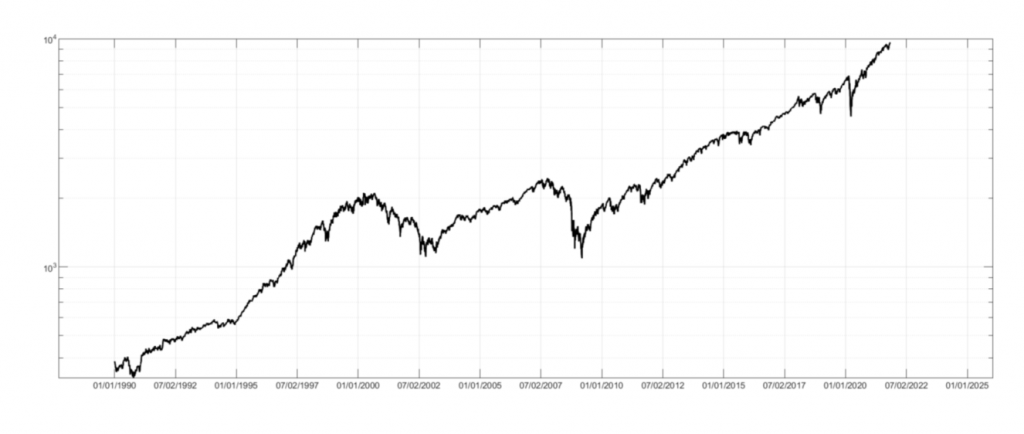 For example, for S&P500 total return daily index (SPXTR) from 1/1/1990 to 10/29/2021: